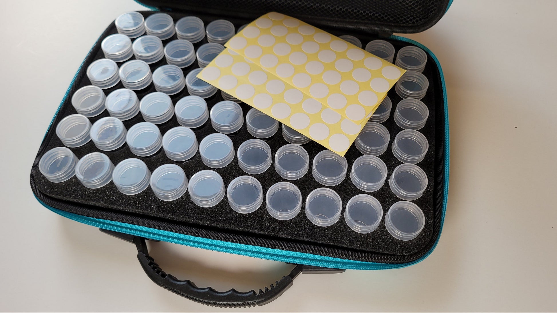 Zusätzlich liegen noch 64 runde Sticker für die Dosen bei. Im Deckel des Koffers befindet sich ein Netz in dem man gut weitere Dinge verstauen kann.
